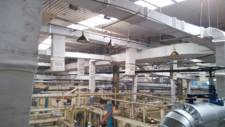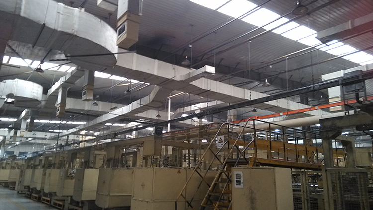 西缸体机加工车间,车间总治理面积11520m2。本项目采用整体厂房分层送风技术治理。采用6台组合式空调油雾净化机组,系统总风量390000m3/h。治理效果:室内氨平均浓度降至0.4mg/m3以下;室内温度、风速达到《工业企业设计卫生标准》要求;室内空气新鲜度达到97%。