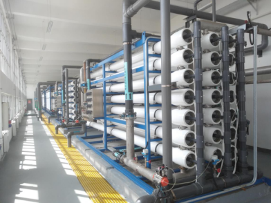 工艺流程:水污处理厂出水→原水泵→自清洗过滤器→超滤系统→中间水池→升压泵→(还原剂、阻垢剂加药)→保安过滤器→高压泵→反渗透装置→除盐水池→除盐水泵→用水点。